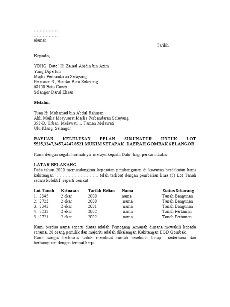 Surat Rayuan Rumah Selangorku - Contoh Iklan from www.mysumber.com Surat rayuan ialah surat yang digunakan untuk membuat rayuan atau permohonan kali kedua untuk mendapatkan sesuatu permohonan yang telah dibuat sebelum ini. Kepada isi rumah yang berpendapatan bawah rm3000 sebulan, anda mampu memiliki rumah dibawah skim program perumahan rakyat (ppr). Siapa tak nak pergi haji kan? Related posts to surat rayuan permohonan akpk. 15 contoh surat permohonan sponsor. Demikian surat permohonan ini kami ajukan atas perhatian dan ijin yang di berikan kami ucapkan banyak terima kasih. Berikut ialah contoh surat rayuan hati yang boleh digunapakai untuk yang mengikut suami atau mengikut isteri (tengok siapa yang dapat tawaran dahulu), sebagai pengiring warga emas dan. Jenis rumah sdh dpt surat menentusahkan hak milik tanah dan sudah mendapatkan pengesahan hak milik tanah di.