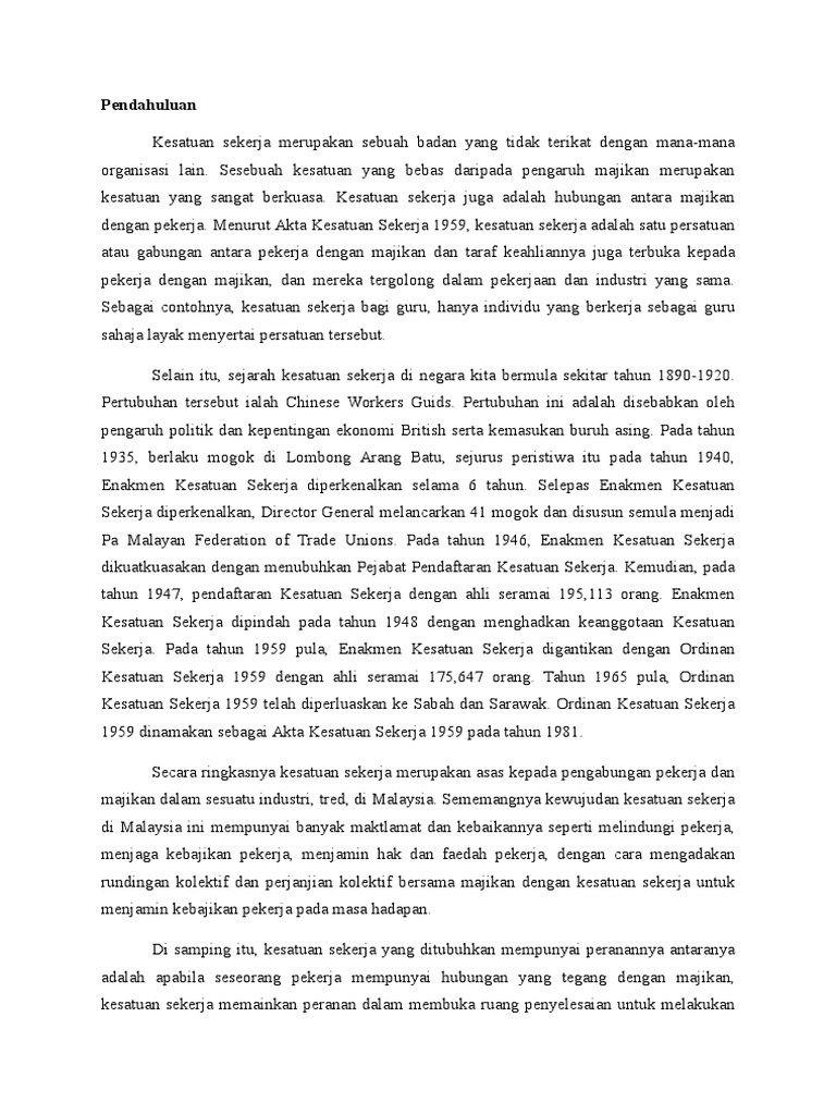 ( ex mufti perlis ). Sebarang urusan, sila hubungi setiausaha agung, sdr rizuan dan juga setiausaha eksekutif, sdr mohd salleh. Kesatuan sekerja merupakan persatuan pekerja yang berkerjasama untuk memperbaiki keadaan di tempat kerja dari segi ekonomi, sosial dan hak asasi @inproceedings{ismail2018peranandp, title={peranan dan penerimaan kesatuan sekerja di malaysia}, author={f. Kongres kesatuan sekerja malaysia (mtuc) mendesak kesatuan sekerja bagi syarikat penerbangan baru, malaysia airlines berhad (mab) kerajaan akan meneliti semula draf pindaan akta kesatuan sekerja 1959 sebelum dibentang di parlimen bagi memastikan ia relevan dengan situasi semasa. Kedutaan dan perwakilan ke malaysia. Pendahuluan pengiktirafan kesatuan sekerja merupakan aspek penting di bawah sistem perhubungan perusahaan di malaysia. Repealed acts are in italics. Malaysia is one of asia's biggest employers of foreign labour. 4.5 pendekatan kesatuan sekerja di malaysia di malaysia, kerajaan begitu berperanan dalam mengawal pergerakan pekerja dan juga mengawasi kesatuan sekerja agar selari dengan matlamat kerajaan dalam meningkatakan ekonomi negara. D/a majlis agama islam dan adat istiadat melayu kelantan kompleks islam darulnaim jalan sultan yahya petra lundang, kota bharu, 15200, malaysia. Kesatuan sekerja di malaysia disediakan oleh: * the online versions of the updated reprints of the laws of malaysia are as marked with an asterisk. Muhammad irfan bin shafie (16bi01159) wan mohd ramdan bin wan hassan (16bi01117) rafiyuddin bin ramli (16bi01149) muhammad aiman bin mohd zulkifli (16bi01158) semester 6le.